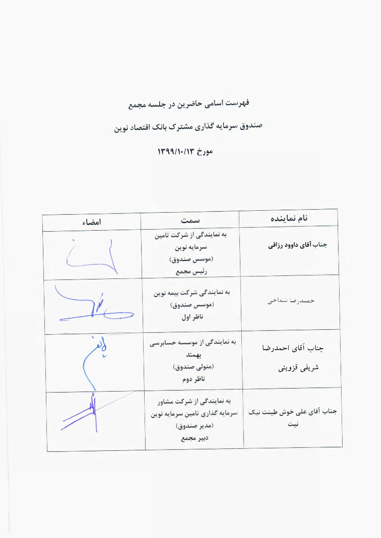 اسامی لیست حاضرین مجمع صندوق سرمایه گذاری مشترک بانک اقتصاد نوین |